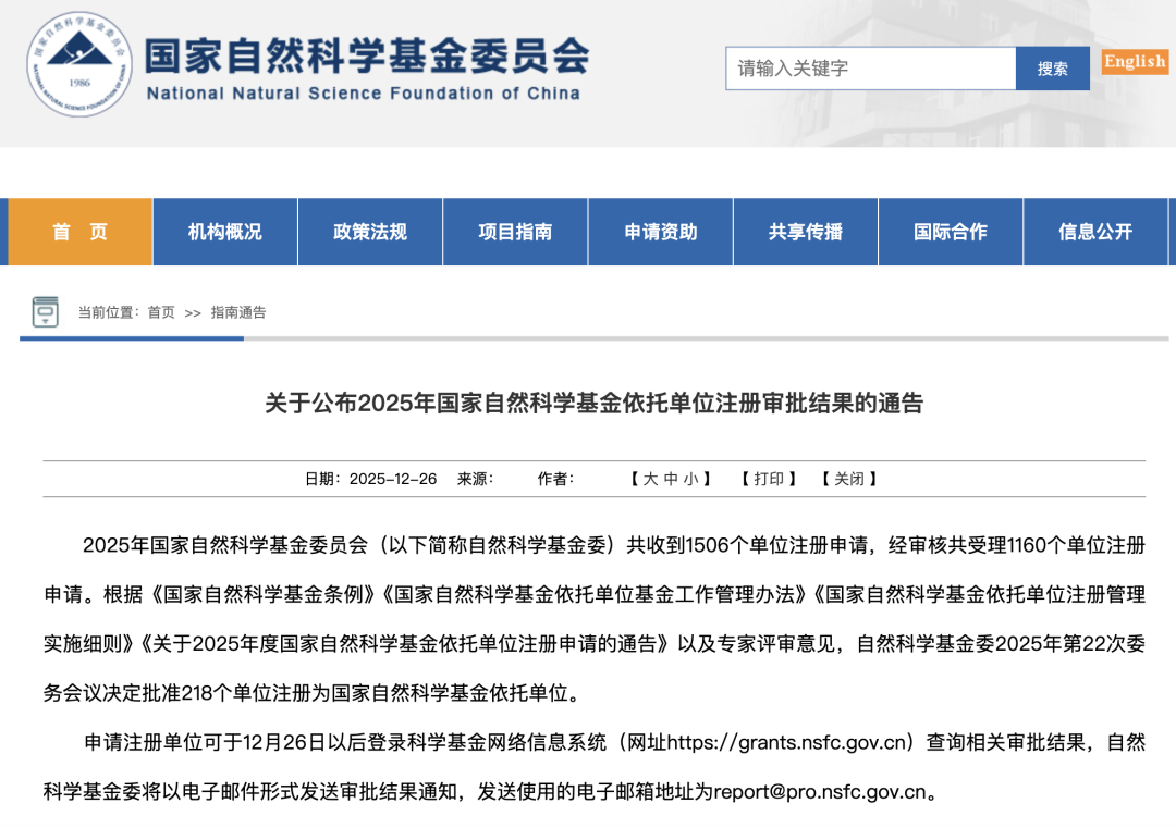 国家自然科学基金依托单位的遴选审批标准严苛、流程严谨,不仅考量申报单位的科研硬实力,更注重其管理规范化水平与创新发展潜力,是对申报单位综合实力的权威认可。据悉,2025年国家自然科学基金委员会共收到1506个单位注册申请,最终仅218个单位成功获批,通过率仅为14.48%,此次获批标志着研究院自2026年起具备独立申报、承担国家自然科学基金项目的资格,充分彰显了研究院在区块链与数据安全领域的科研积淀与发展潜力,将为区块链与数据安全领域的基础研究与技术创新注入更强动力!