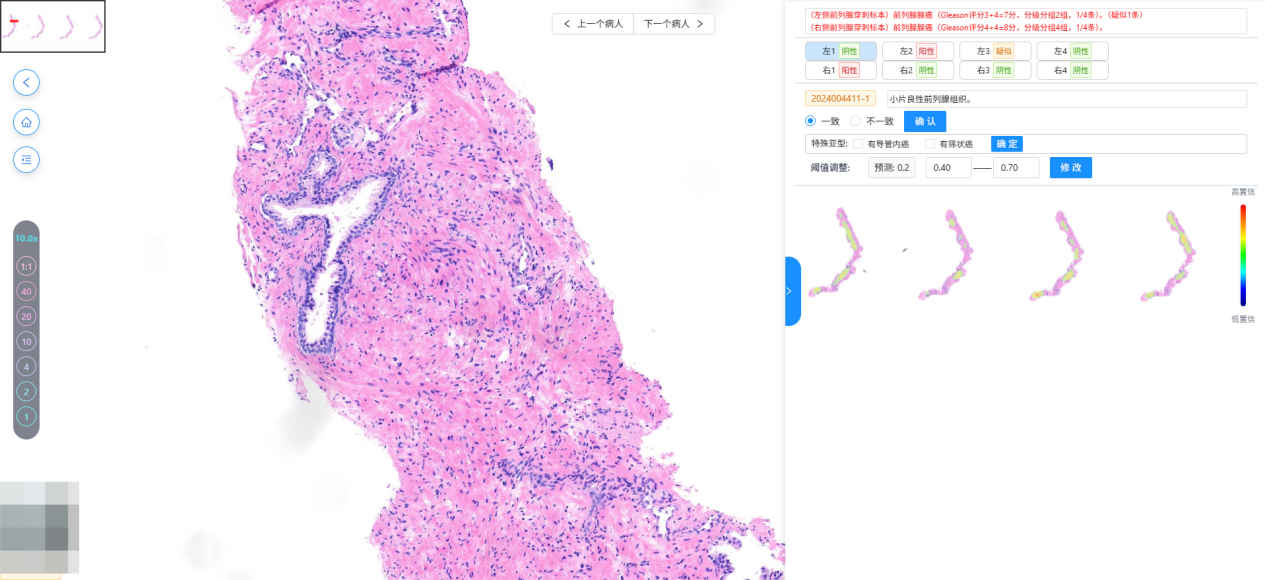 系统集成术前筛查、术后诊断、预后评估三大功能,在前列腺癌、胃癌等常见肿瘤检测中准确率达98%,单张切片阅片时间从数分钟压缩至几秒,诊断效率提升10倍以上,可基于随访数据预测肿瘤复发风险,支撑个体化治疗方案制定。