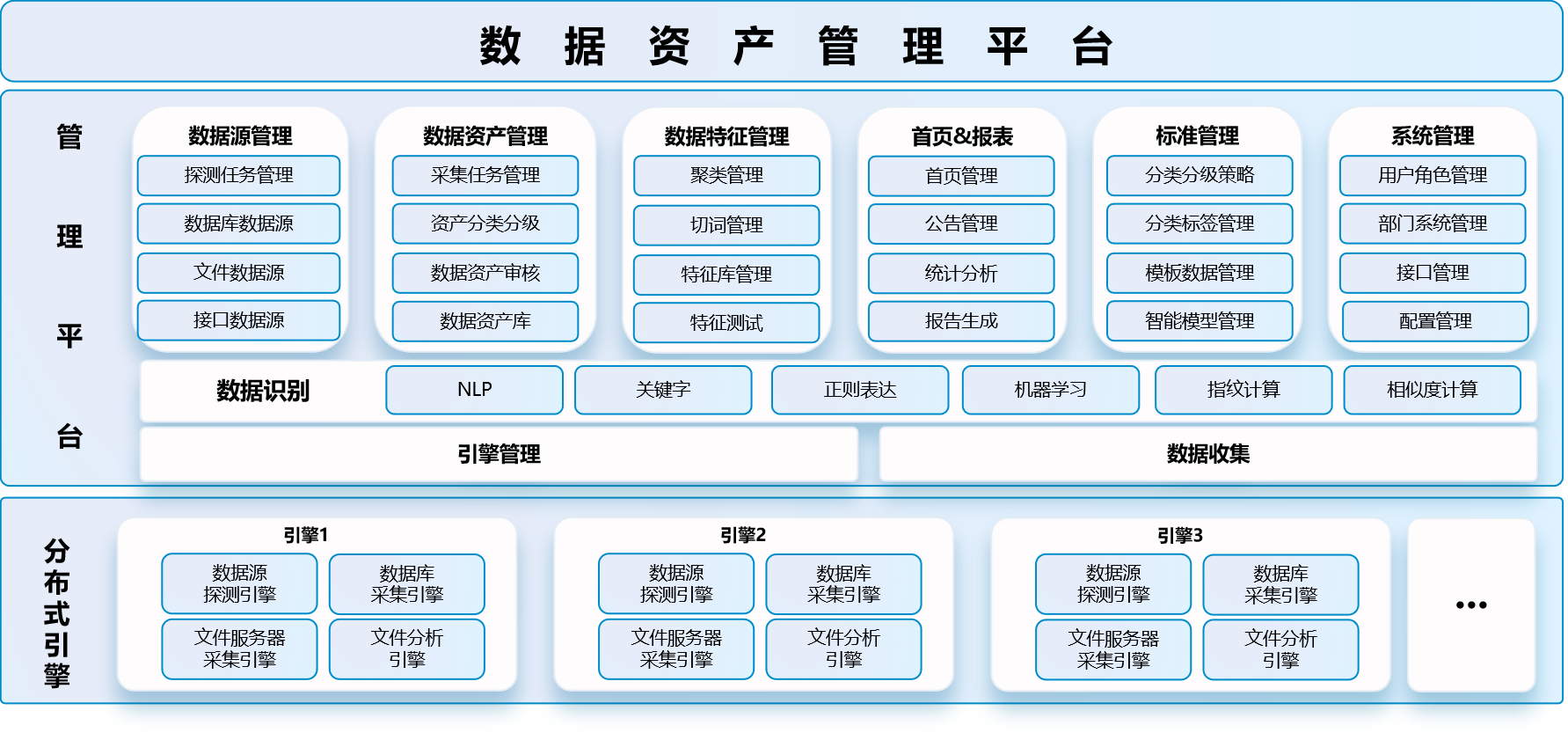 数据资产管理平台是所有数据安全相关工作开展的前提,平台旨在帮助单位建立数据资产台账,具备“一站式”数据资产管理、多样化自动化分类引擎确保结果准确性、灵活可扩展的部署模式、支持自定义对外接口等特点,为数据安全保护提供资产底数支撑。