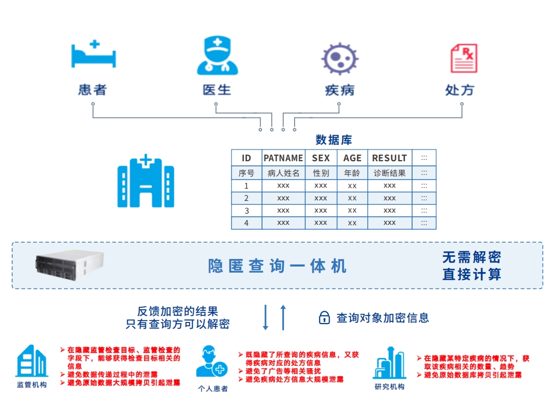 隐匿一体机适用于金融、医疗、电信等行业,不仅提升了数据查询的安全性,还帮助企业遵守数据保护法规,如GDPR和CCPA。它通过技术创新,为数据隐私保护提供了切实可行的解决方案,是企业构建隐私友好型数据生态系统的理想选择。目前在医疗行业数据流通成功应用。